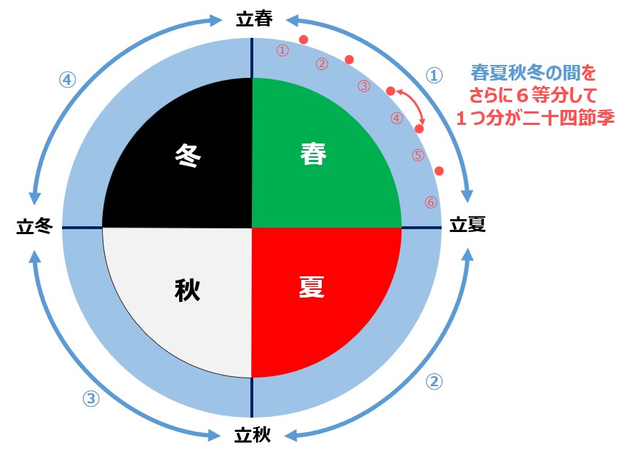 まずは、立春、立夏、立秋、立冬で1年を四等分します。そして、1つの季節をさらに6等分して、二十四節季として表しています。