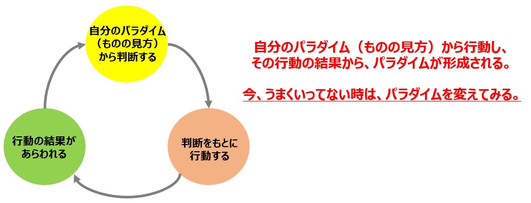 自分の過去の経験・結果から、パラダイムを形成しており、そのパラダイムをもとに行動の判断をしていきます。そして、その行動の結果から、また、パラダイムを形成します。