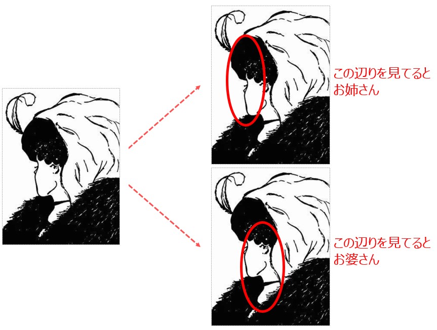 有名なお姉さんとお婆さんのだまし絵でも視点によって、見え方が違います。
