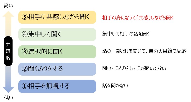 わたしたちは、一番高いレベルの「⑤相手に共感しながら聞く」を目指しましょう。