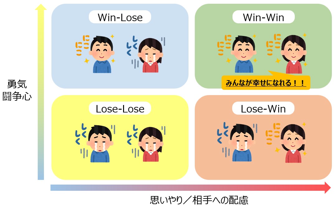 「勇気や闘争心」「思いやりや相手への配慮」の気持ちを持ったうえで「みんなが幸せになれる!」というマインドがあると「Win-Win」にたどり着くことができます。