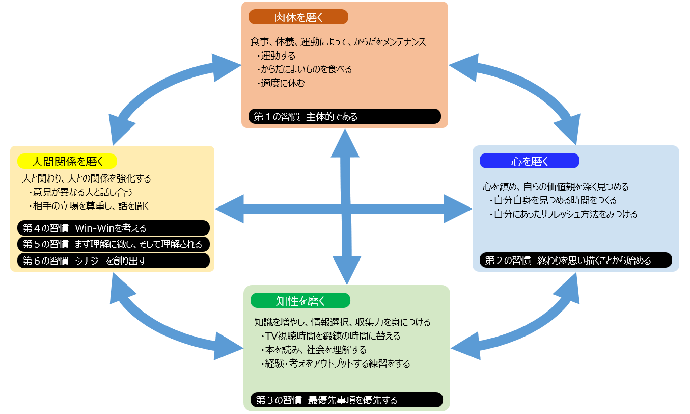 第7の習慣は、肉体・心・知性・人間関係の4つの観点で、バランスよく自分をみがいていく習慣です。