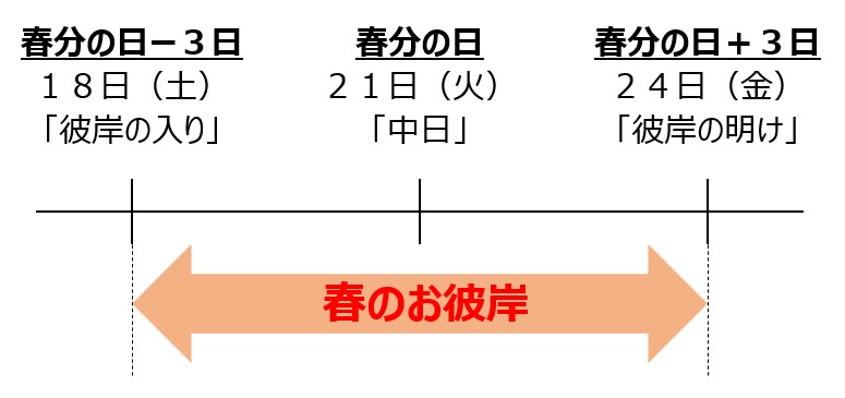 2023年の場合は、3月21日(火)が春分の日ですので、その3日前の18日を「彼岸の入り」、3日後の24日を「彼岸の明け」となります。