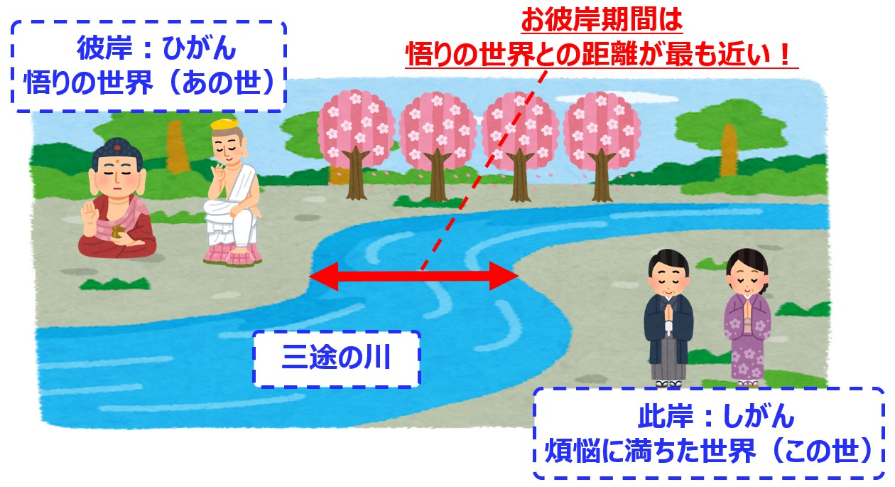 また、この期間に仏教修行を行うことで、悟りの境地である**「彼岸」に到達することができる**、という思想が生まれましたので、昔から、お彼岸期間はお墓参りや法要を行います。