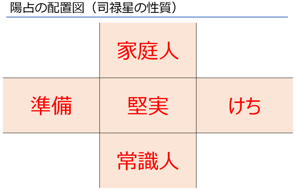 陽占の中央、北方、東方、南方、西方に出現する十大主星は、その人の性格を強く表しています。