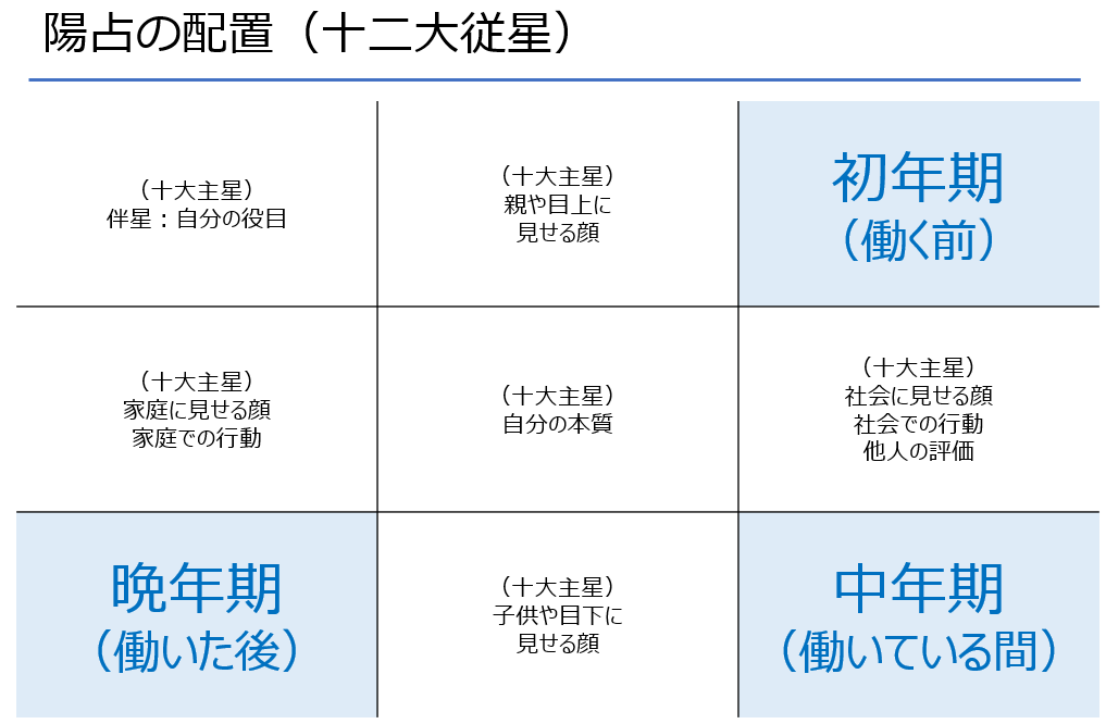 陽占の、北東、南東、南西に出現する十二大従星は、人間の一生を表しております。