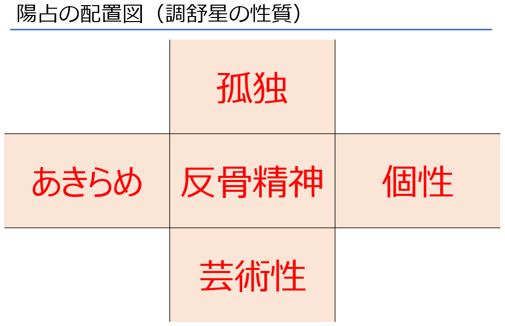調舒星を中央に持つ人は、鋭い感性と強烈な個性を持っています。人と違った強烈な個性を持っていますので、人間関係も偏ったものになります。好きな人は好きですが、嫌いな人はトコトン嫌いです。